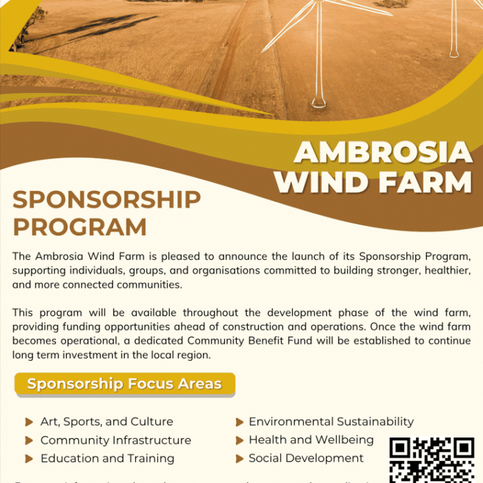 The Ambrosia Wind Farm is pleased to announce the launch of its Community Sponsorship Program, supporting local projects, events, and initiatives that contribute to vibrant, resilient, and connected communities. ...